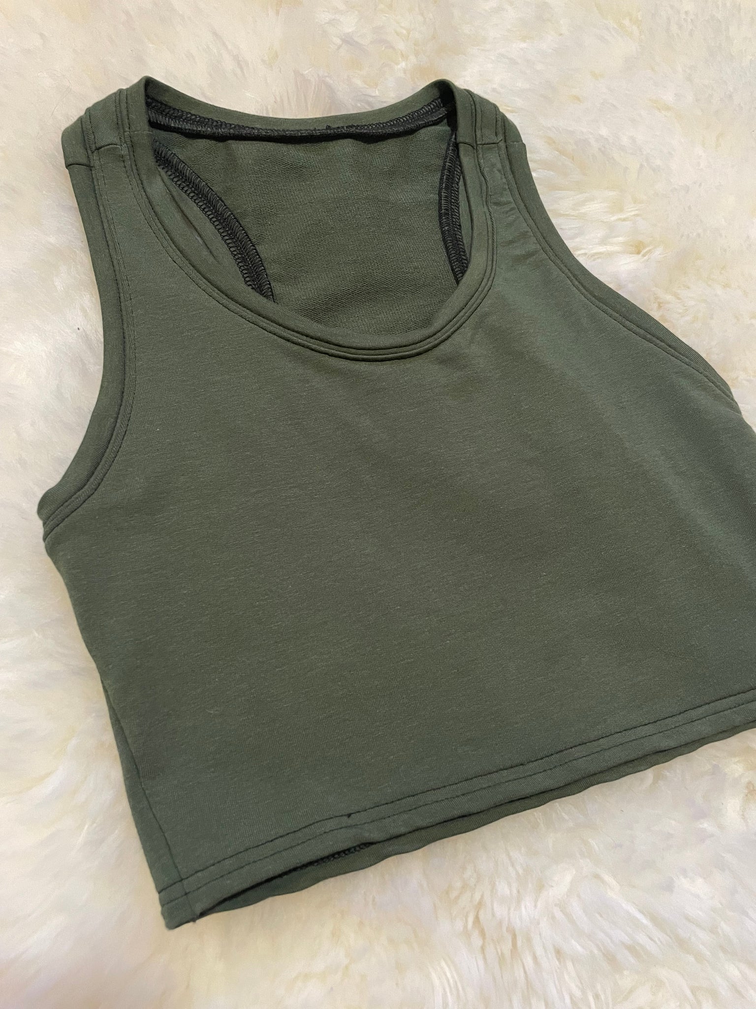 Basic bamboo cropped racerback tank with a scooped seam in the back.
